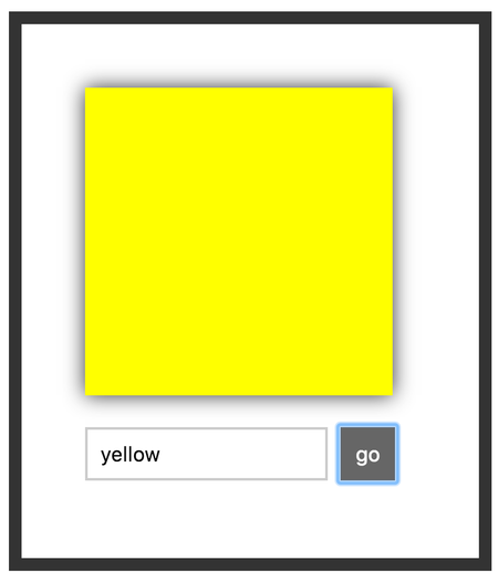 <iframe id="I" border="0" frameborder="0" name="I2" src="https://www.kirupa.com/react/examples/colorizer.htm" marginheight="0" marginwidth="0"></iframe>Colorizer 会用你提供的颜色给当前白色正方形上色。要看到它起作用,请在文本框中输入颜色值,点击 Go 按钮。如果不知道要输入什么颜色,就填 yellow 好了。一旦你提供了一个颜色,并提交了,白色正方形就会变成你提供的颜色: